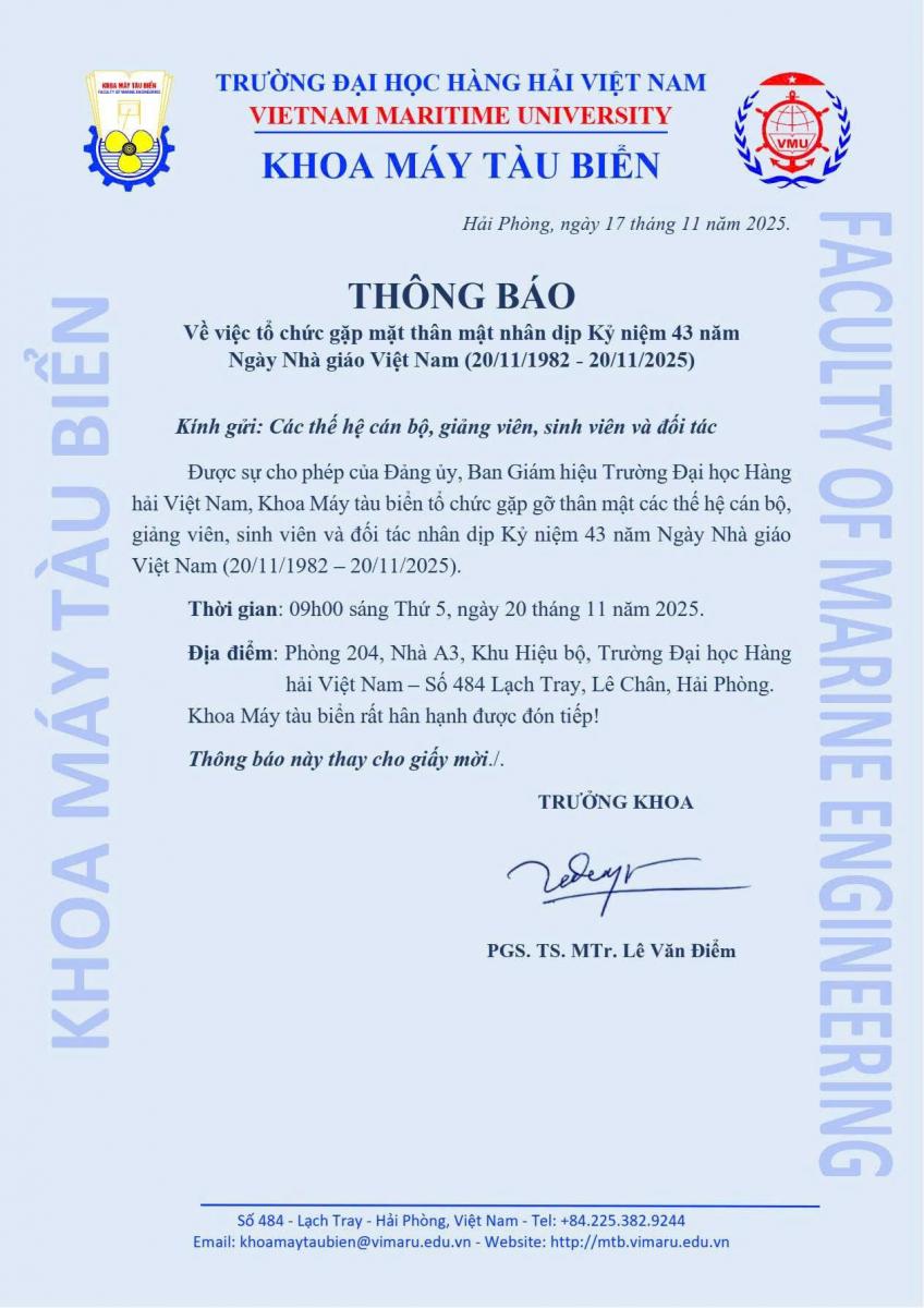 THÔNG BÁO: Về việc tổ chức gặp mặt thân mật nhân dịp Kỷ niệm 43 năm Ngày Nhà giáo Việt Nam (20/11/1982 - 20/11/2025)
