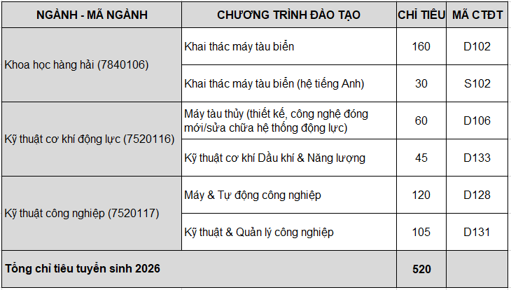 Theo đề án tuyển sinh năm 2026 được Hội đồng Khoa học và Đào tạo, Trường Đại học Hàng hải Việt Nam phê duyệt, năm 2026, Khoa Máy tàu biển được giao 490 chỉ tiêu đại học chính quy cho 5 CTĐT thuộc ngành Kỹ thuật cơ khí động lực và Kỹ thuật công nghiệp. Ngoài ra, chương trình đào tạo Khai thác máy tàu biển hệ chọn (học bằng tiếng Anh) được giao 30 chỉ tiêu. Chi tiết chỉ tiêu tuyển sinh các chương trình đào tạo năm 2026 như ở bảng dưới.