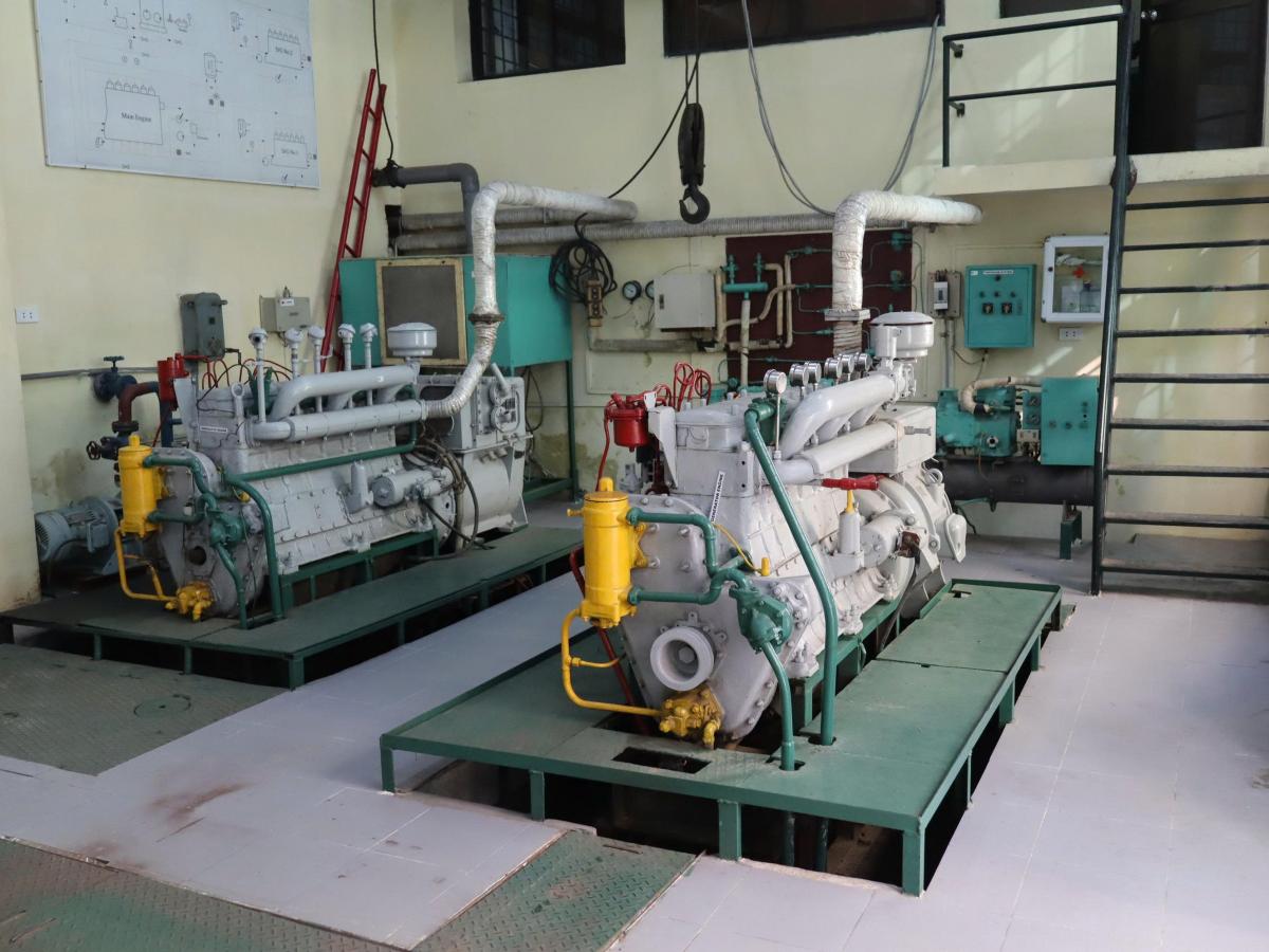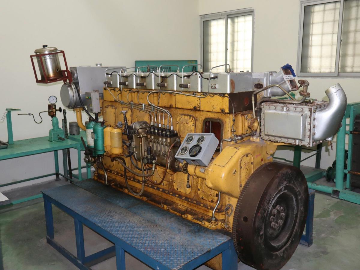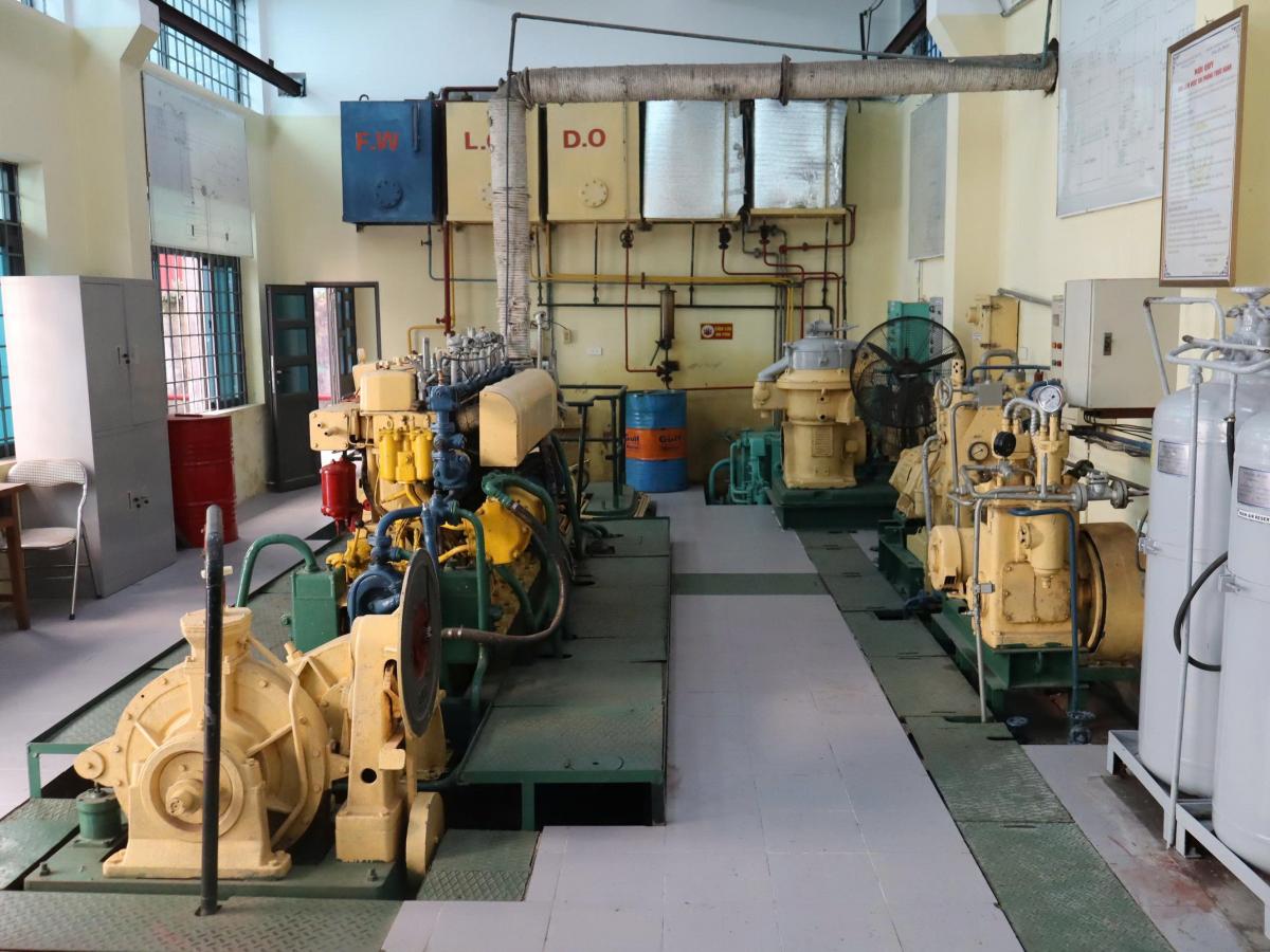 - Phòng thực hành Buồng máy trang bị toàn bộ các trang thiết bị và các hệ thống của một buồng máy tàu thủy như động cơ diesel lai chân vịt, các diesel lai máy phát, trạm phát điện, hệ thống máy lọc, hệ thống nhiên liệu, dầu bôi trơn, nước làm mát, hệ thống lạnh thực phẩm… giúp sinh viên làm quen công việc vận hành các thiết bị buồng máy trước khi bước chân xuống tàu thực tập: