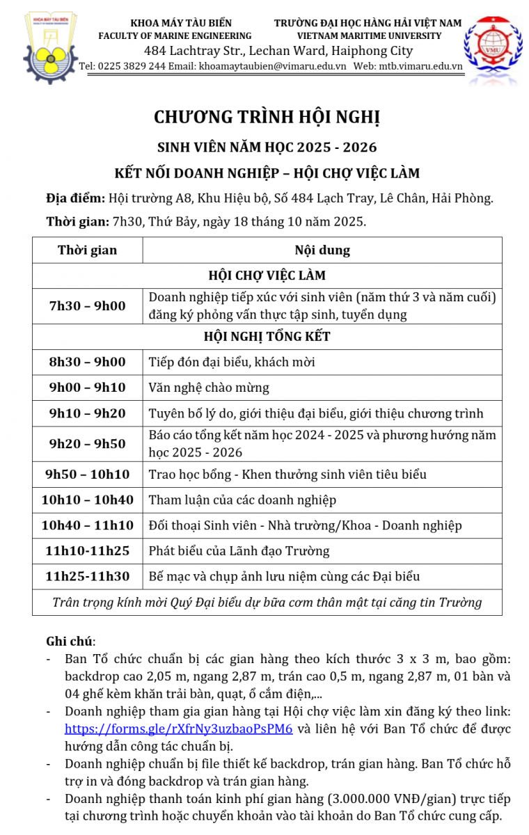 Thực hiện kế hoạch năm học 2025-2026, Khoa Máy tàu biển tổ chức Hội nghị sinh viên kết Hội chợ việc lần thứ 3 nhằm đánh giá kết quả năm học và kết nối sinh viên sắp tốt nghiệp với Doanh nghiệp và Nhà tuyển dụng.