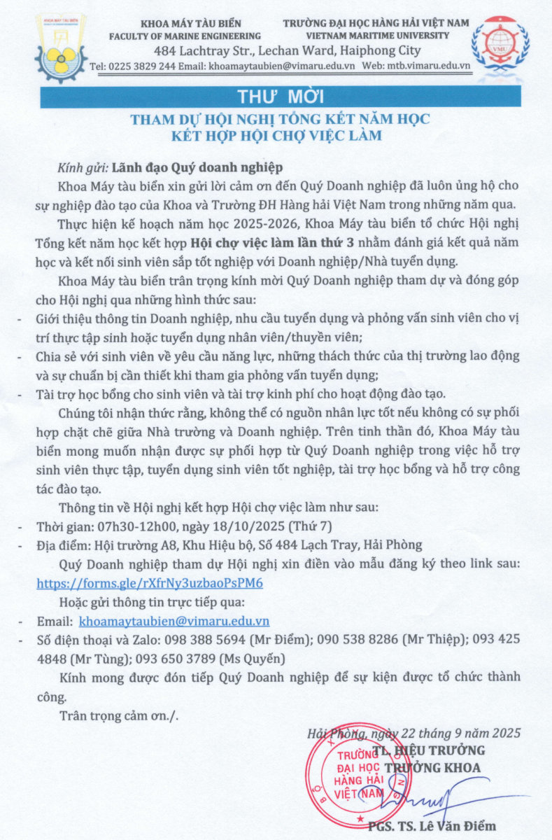 Khoa Máy tàu biển trân trọng kính mời Quý Doanh nghiệp tham dự và đóng góp cho Hội nghị qua những hình thức như sau: